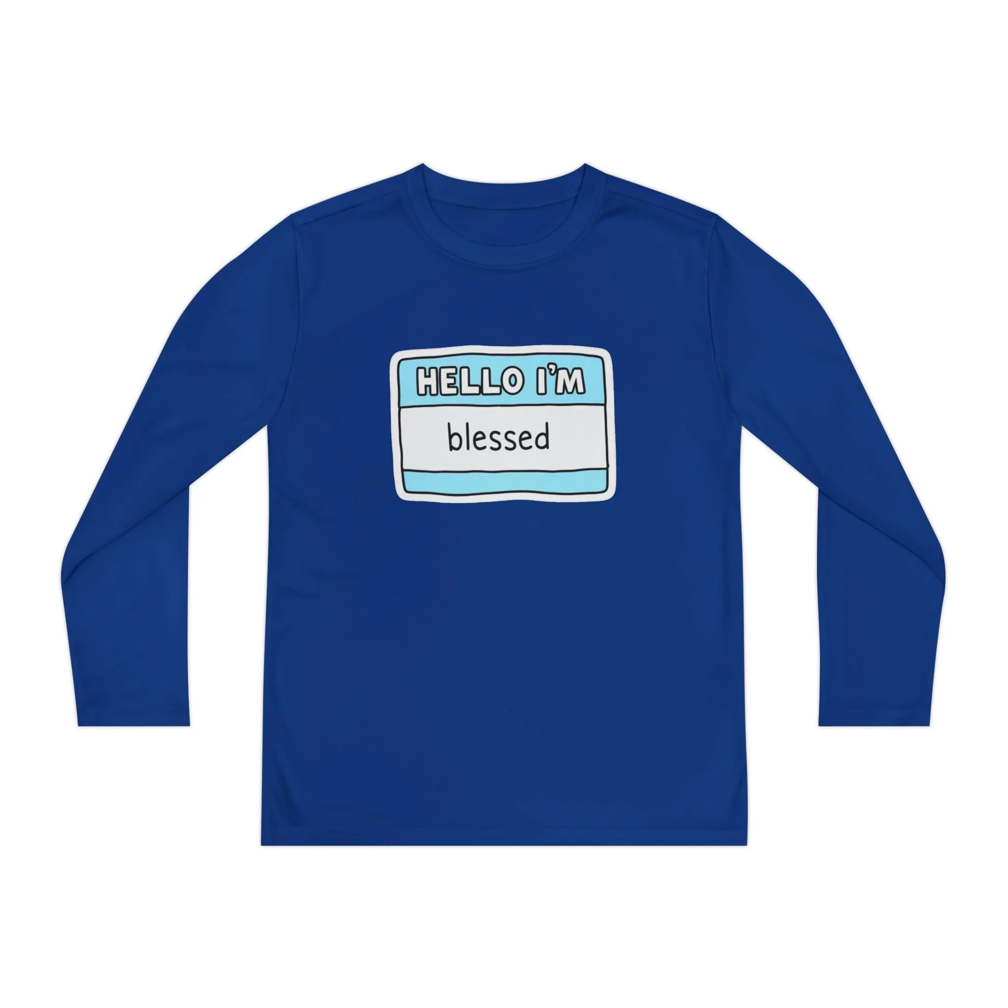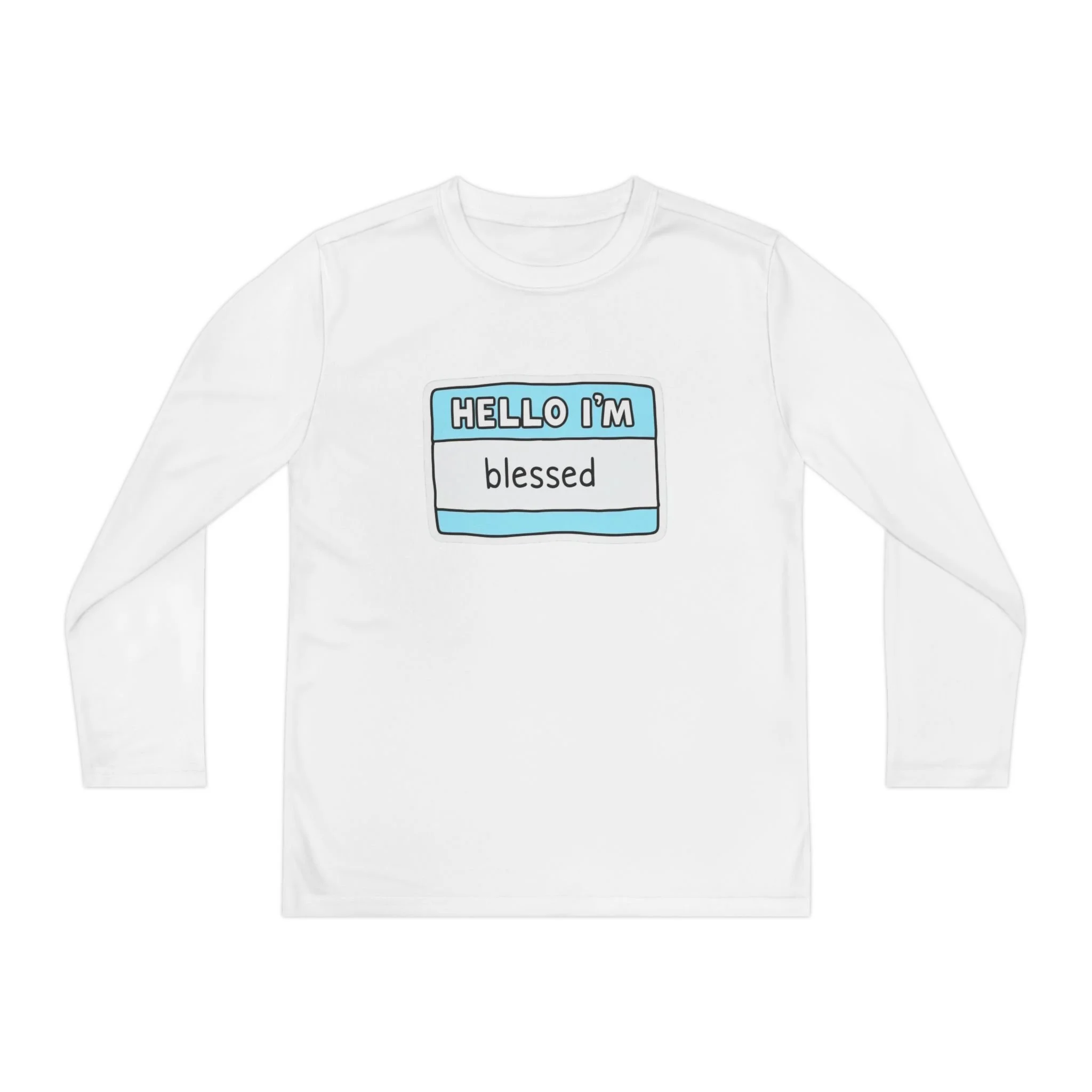 Lightweight performance long sleeve with a bright, cheerful badge-style design that says “HELLO I’M blessed.” Breathable polyester keeps active kids cool and dry during practice, playground games, or weekend outings. The athletic cut moves with them while the DTF print stays vibrant through washes. Soft-feeling, tear-away label for itch-free wear. A simple, upbeat piece that layers easily under hoodies or pairs with shorts for warm-weather play.
